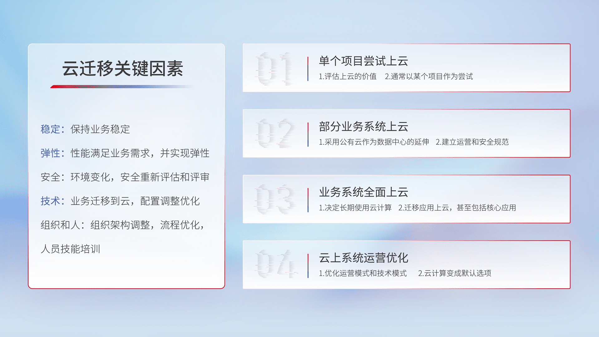 结合实际业务,,从规划设计、、云平台选型、、、云原生改造、、、数据迁移、、集成交付,,,迁移全过程为客户识别最佳上云路径,,,,做好风险识别管理,,,,设计网络架构、、身份权限、、安全审计合规、、、操作审计、、、日志审计、、、、监控告警策略、、多站点容灾设计等,,,对云上基础设施进行整体规划,,,提升IT治理水平,,,,以满足弹性、、、、高可用、、高性能的需求。。