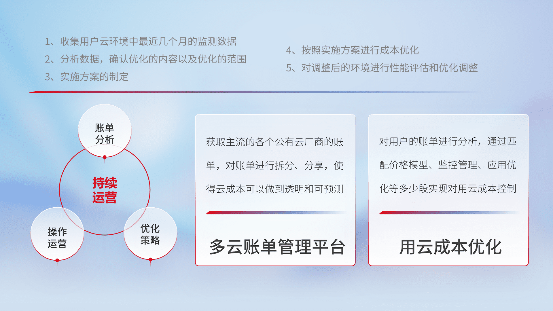 通过多云纳管,,,以统一的资源数据模型把客户的云资源进行抽象和封装,,,进而实现对多云资源的统一操作,,,保障云资源管理的可靠性、、、、稳定性与可用性。。。。量身定制化运维内容,,,,配置、、开发运维、、、补丁管理、、、、备份、、、监控、、、认证和访问管理、、、审计和日常巡检等,,,保障在用云过程中的可靠度,,,稳定度以及高可用率。。。。