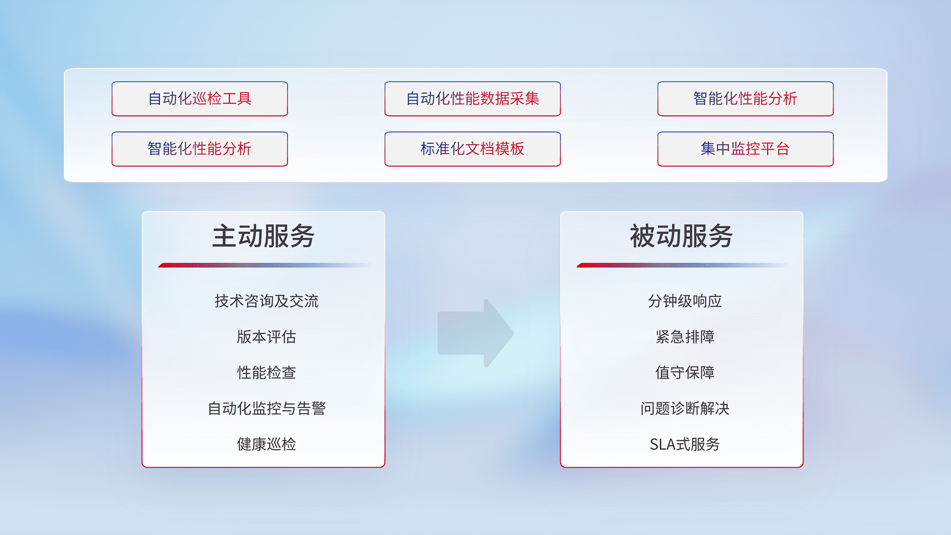 智能化工具和标准化文档,,保障服务质量,,,,提供主动服务(包含技术咨询、、、版本评估、、性能检查、、自动化监控与告警、、、、健康巡检)和被动服务包含(分钟级响应、、、、紧急排障、、值守保障、、、问题诊断解决、、、SLA服务)。。